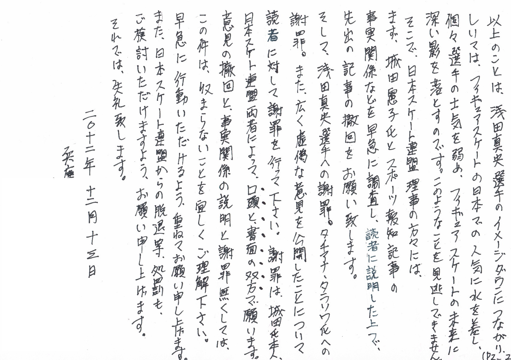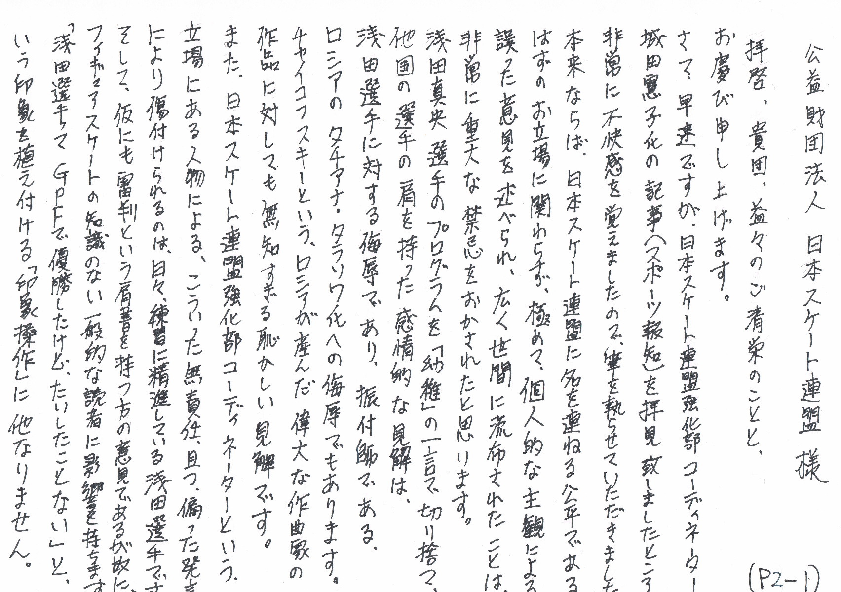 プレ五輪シーズンに、しかも、スケ連の肩書を名乗った立場で、事実無根な記事を載せるなんて、いったい、オリンピックで日本人を勝たせたいのか?負けさせたいのか?…的なことを書きましたが、本人の手元まで届くかどうか…。